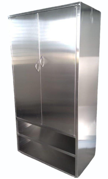SS cabinet with rods for hanging aprons and two under-shelves for folded garments or shoe placement.